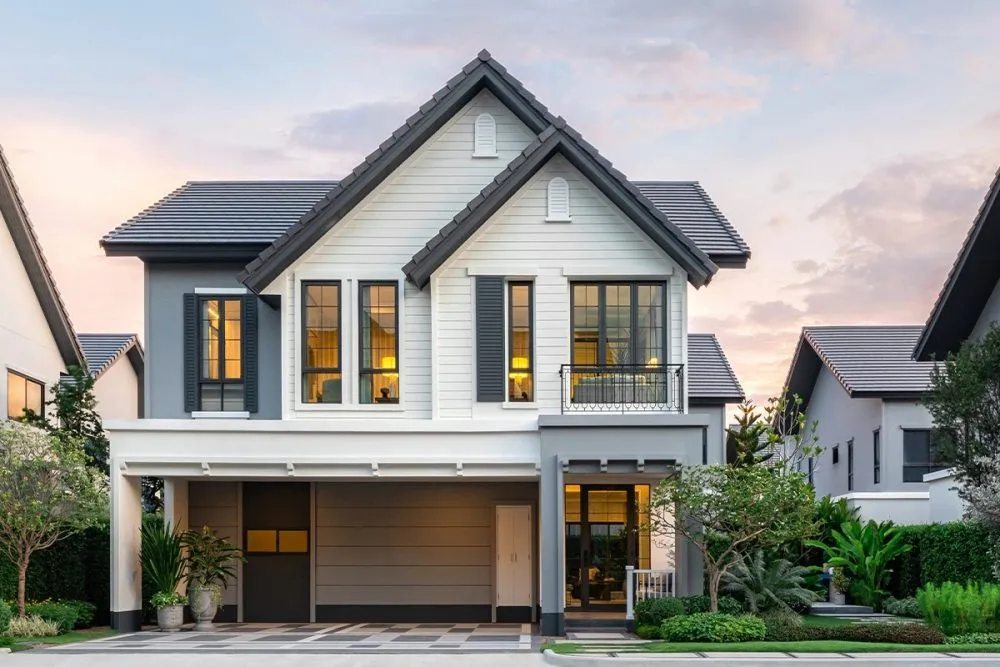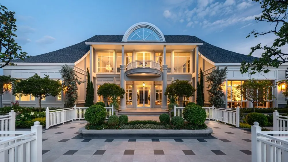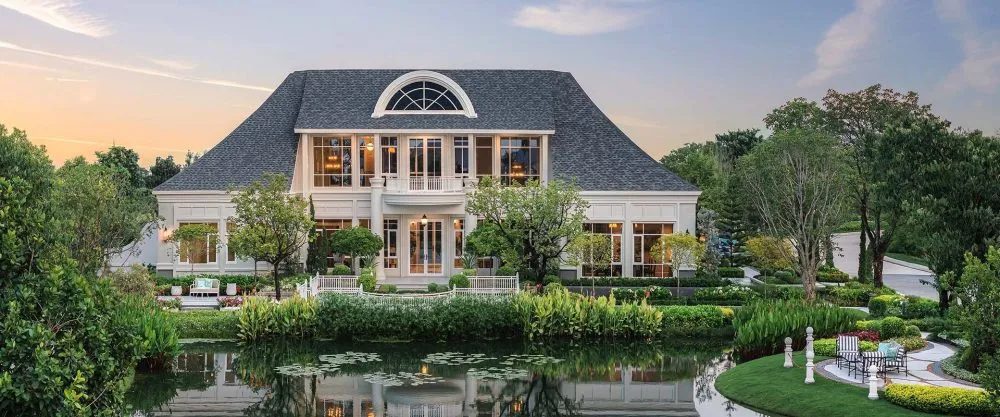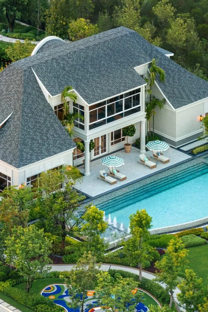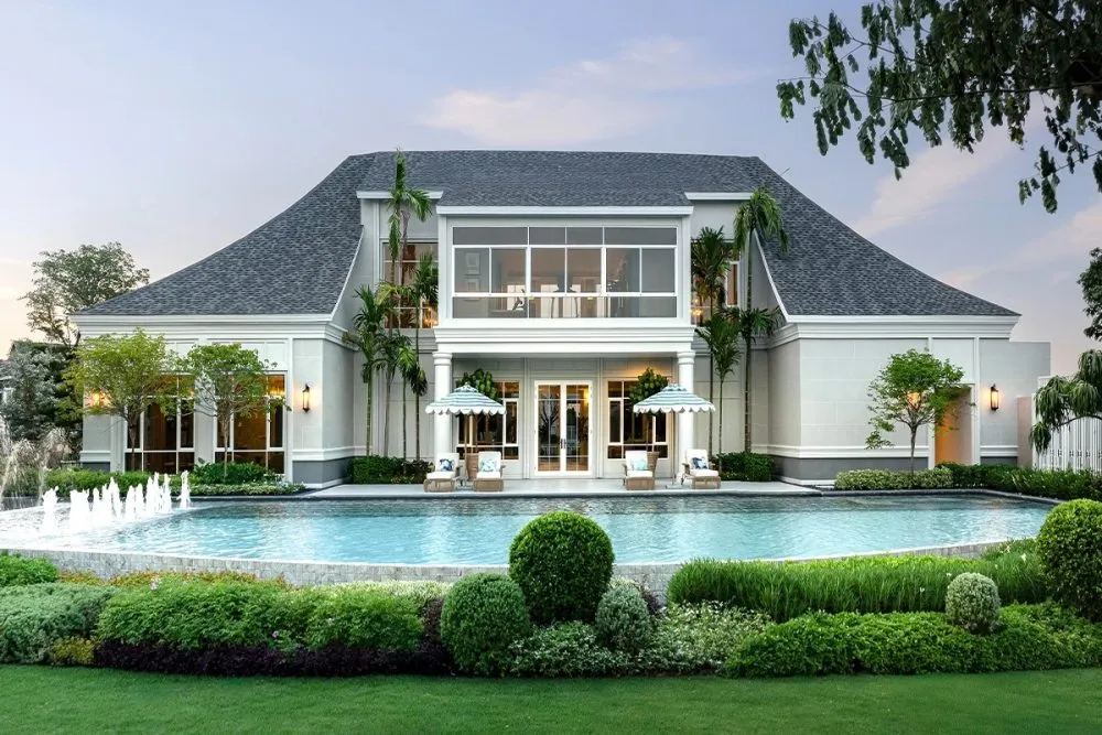 New England Colonial ถูกตีความใหม่ในสไตล์รีสอร์ต ด้วยเฉลียงหน้าบ้าน และระเบียงชั้นสองที่กว้างขวาง